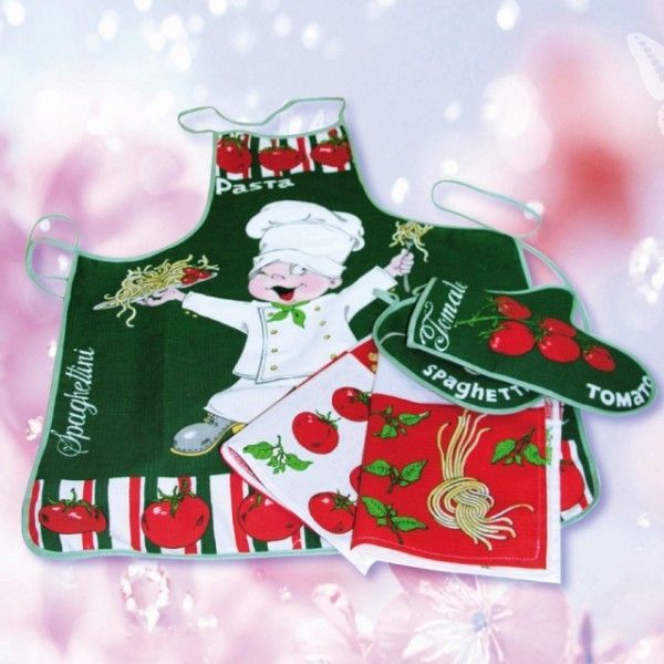 В комплект входит: фартук, прихватка, варежка, полотенце 40х60 см.
